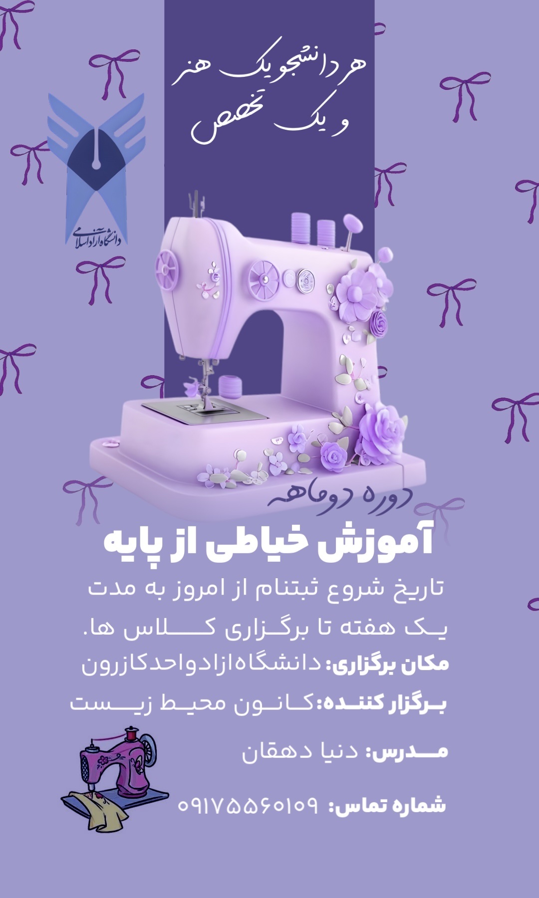 کانون فرهنگی محیط زیست از اوایل اردیبهشت ماه ۱۴۰۴ اقدام به آموزش خیاطی با تدریس خانم دنیا دهقان نمود این آموزش در یک دوره دو ماهه بصورت دو روز در هفته این آموزش انجام میگیرد.