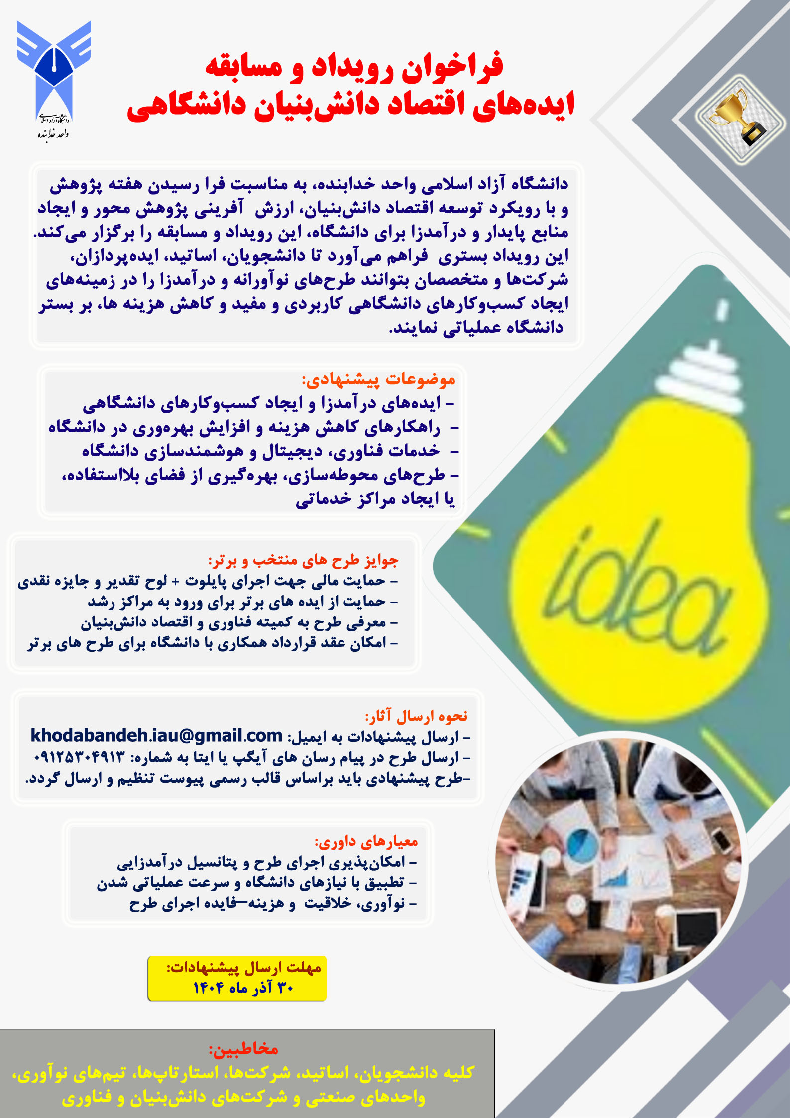 دانشگاه آزاد اسلامی واحد خدابنده، به مناسبت فرا رسیدن هفته پژوهش و با رویکرد توسعه اقتصاد دانشبنیان، ارزش آفرینی پژوهش محور و ایجاد منابع پایدار و درآمدزا برای دانشگاه، این رویداد و مسابقه را برگزار میکند. این رویداد بستر مناسبی فراهم میآورد تا دانشجویان، اساتید، ایدهپردازان، شرکتها، صنعتگران و متخصصان بتوانند طرحهای نوآورانه و درآمدزای خود را در زمینههای ایجاد کسبوکارهای دانشگاهی، کاهش هزینه¬ها و بر بستر دانشگاه عملیاتی نمایند. هدف از این رویداد، شناسایی، حمایت و عملیاتیسازی ایدههایی است که قابلیت تبدیلشدن به پروژههای پژوهشی یا خدمات پایدار و درآمدزای دانشگاهی را داشته و بتوانند نقش مؤثری در ارتقای سطح اقتصادی و فناورانه این واحد دانشگاهی ایفا کنند.